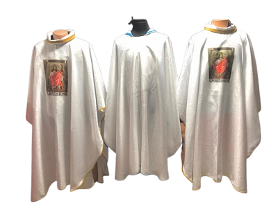 White chasuble with gold or blue neck , sides trimmings and CHRIST THE KING design front and available.MATERIAL TYPE- Soft patterned fabric, available in polyester, silk,and other fabric variants.