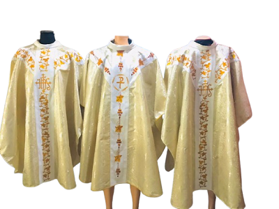 A gold chasuble with a shimmering fabric, featuring a white central braid embroidered with golden religious symbols like "IHS" or "PX," along with intricate floral and vine motifs for a sacred, elegant look.