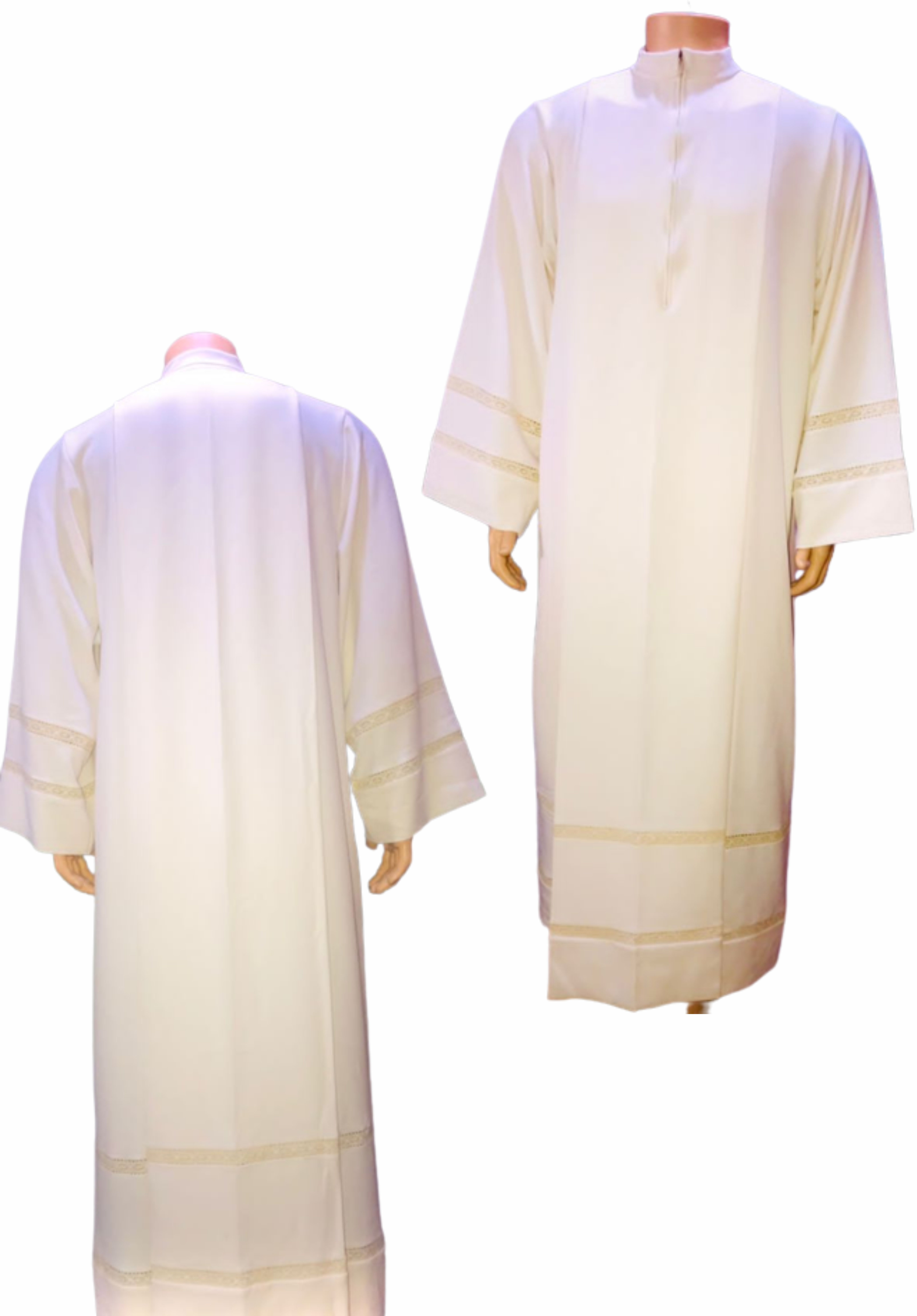 Quality cotton made clerical alb with lace trimmings and a well designed run up front zip.
