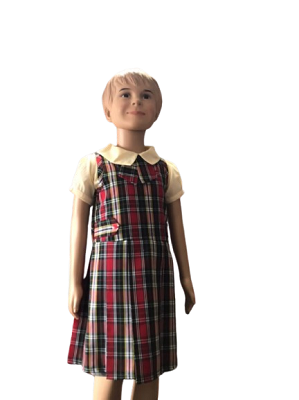Red background check pleated pinafore dress with cream sleeves ,collar ,check tie and side straps with buttons.MATERIAL TYPE: check polyester ,cotton blend.Available in colors.CARE INSTRUCTIONS: wash…