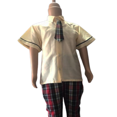 Cream shirt with check attached ties plus buttons,sleeve trimmings and check trouser with zip and elastic waist band(optional).Can come as a set or request single.MATERIAL TYPE: Cotton blend and check…